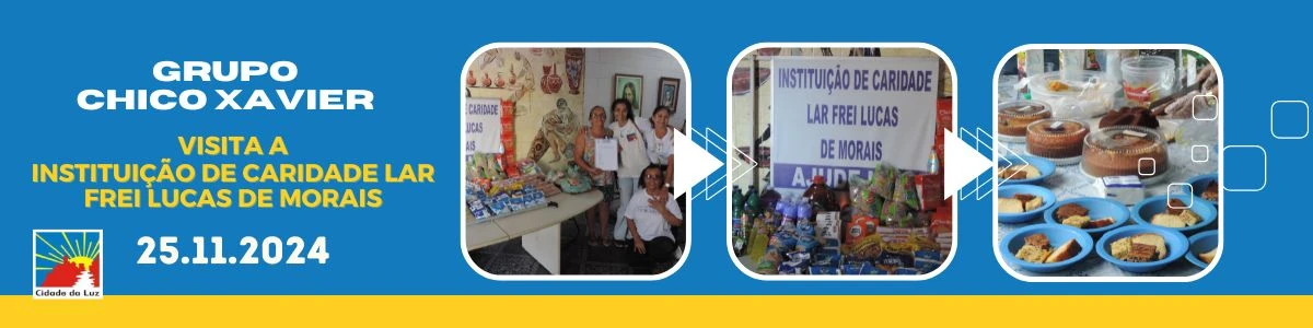 No dia 25/11/2024, a Caravana Chico Xavier realizou uma visita especial a Instituição de caridade Lar Frei Lucas de Morais , levando não apenas alimentos e materiais de higiene, mas também muito carinho e solidariedade. Durante a tarde, os participantes tiveram a oportunidade de desfrutar de lanches, conversar e compartilhar momentos de alegria, promovendo um ambiente acolhedor e de companheirismo para todos os presentes. A ação refletiu o verdadeiro espírito de fraternidade e amor ao próximo, lemas da Cidade da Luz.